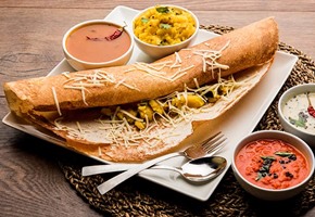 Dosas: these are large, wafer-thin and crepe-like rice pancakes that are usually filled with vegetables, chutneys, or masala curries. Utthapams are similar but thicker with the filling spread on top like a pizza.