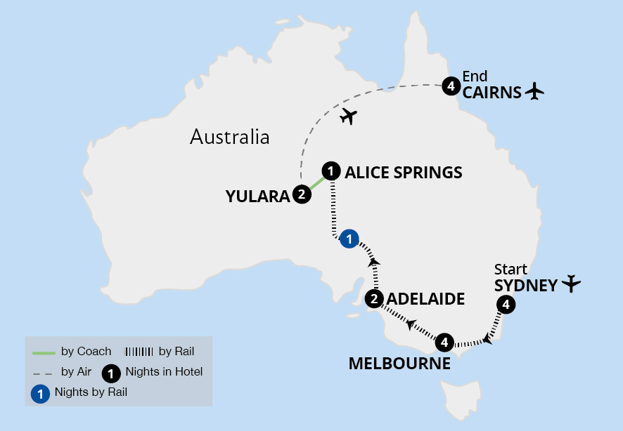 Join us on an epic adventure into this vast, vibrant and varied land to experience Australia's spectacular natural wonders, from the rainforests of tropical Cairns and kaleidoscopic colours of the Great Barrier Reef to the burnished red tones of the ancient sacred site of Uluru. Explore laid-back Adelaide and its world-acclaimed wine region...