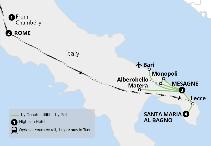 Arriving by plane, enjoy our scenic base in a hotel overlooking the coast of Monopoli. From here, experience the incredible sights and traditions of Puglia, a place untouched by the hands of time. Rich with UNESCO World Heritage sites, discover the spectacular trulli homes of Alberobello and the sassi cave dwellings in the cliffside town of...