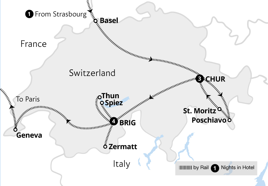 Staggering mountain peaks and serene alpine lakes provide the extraordinary setting for this holiday as we travel in First Class all the way, including on the iconic Bernina Express and Glacier Express. Staying in the Engadine Valley and the popular mountain resort of Zermatt provides idyllic bases from which to explore the Swiss Alps by rail. ...
