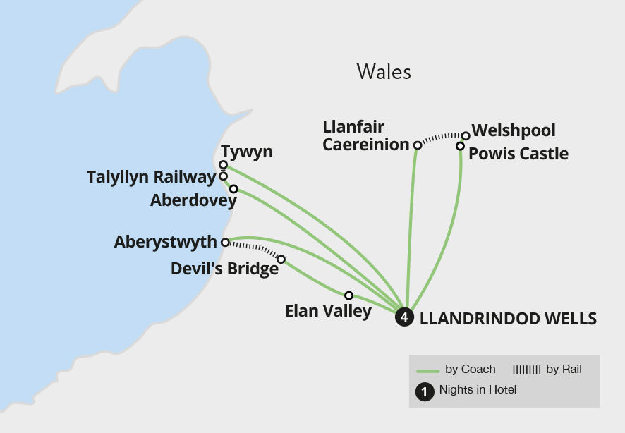 From picturesque coastlines to rolling hills, explore the beautiful heart of Wales on classic heritage rail journeys from a base in a picturesque spa town, Llandrindod Wells. Journey on the nostalgic Vale of Rheidol, Talyllyn and Welsh & Llanfair railways and join a ranger on a private tour of the Elan Valley, also known as the 'Welsh Lake...