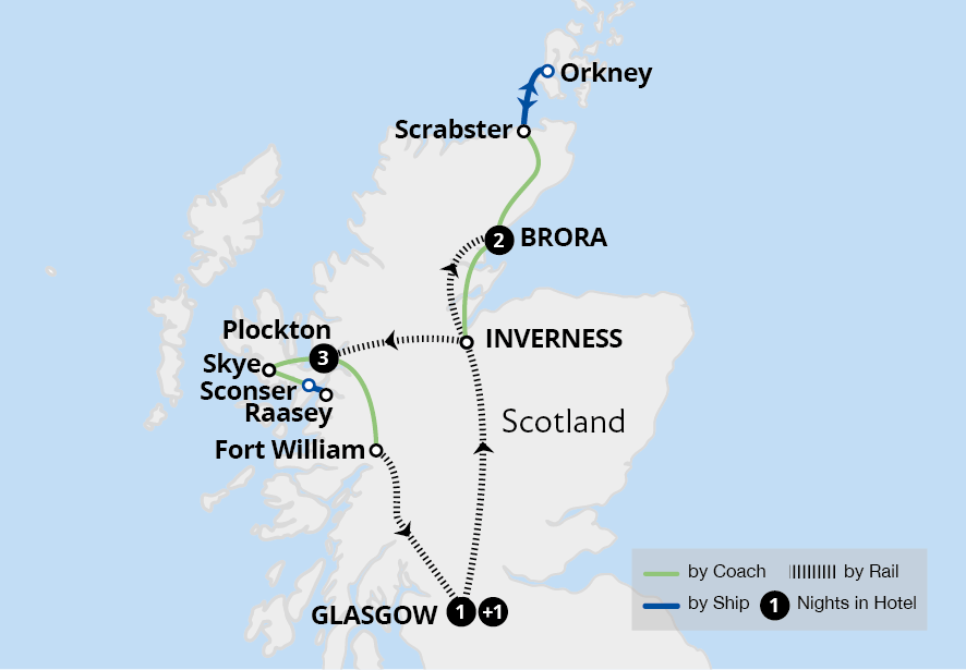 Let the rugged beauty of Scotland capture your heart on this seven-night holiday. Starting in Glasgow, journey through stunning landscapes to Scotland's mystic north. Tour the Orkney Islands and discover ancient Neolithic sites including Skara Brae and marvel at the beauty of the great houses of the northern Highlands, Dunrobin and Dunvegan. ...