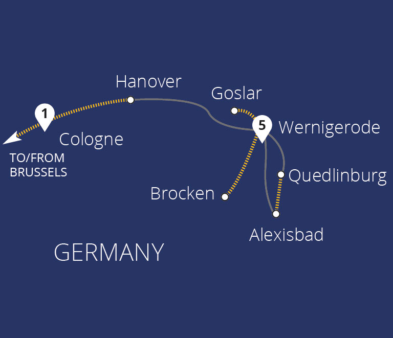 Join us on a magical winter journey amongst the scenic valleys and mountain peaks of Germany's Harz Mountains. Travel on two heritage steam trains, including the Brocken Railway, and discover World Heritage towns with medieval architecture and cobbled lanes. Our base is Wernigerode, a town with timber-framed buildings and a fairytale castle,...