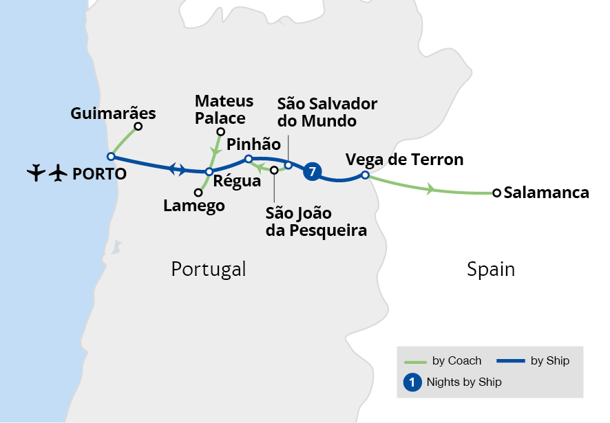 “A short cruise up and down the Douro, stopping at various points and including interesting visits to Porto, Salamanca, Almego and Guimaraes