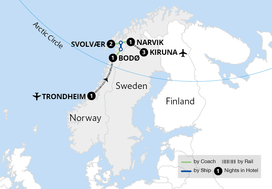 Spellbinding Scandinavian rail journeys take us from the ancient Viking capital of Trondheim to Swedish Lapland, visiting the best places to see the Aurora Borealis, with many opportunities to experience these swirling lights. Travelling by rail through amazing landscapes, cross the Arctic Circle to Bodø to seek the ethereal Northern Lights on a...