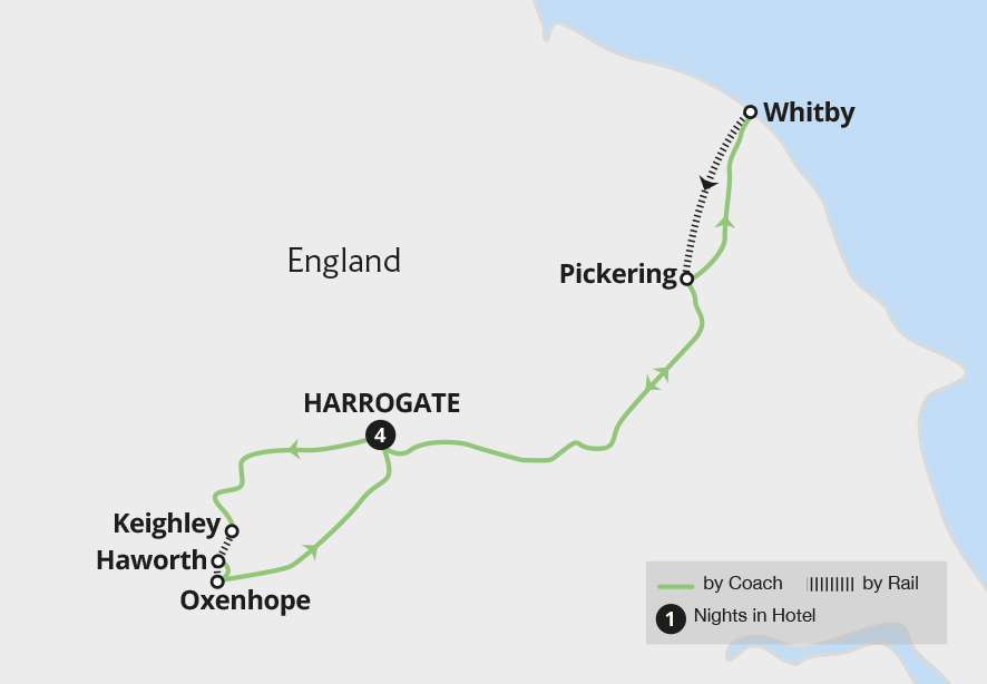 Stay in the elegant spa town of Harrogate and visit the coastal resort of Whitby, before enjoying a nostalgic journey on the North Yorkshire Moors Railway. Uncover Yorkshire's hidden gems, discover the landscapes which inspired the Brontë sisters and travel into the steep valleys of Yorkshire's industrial past aboard the Keighley & Worth Valley Railway.