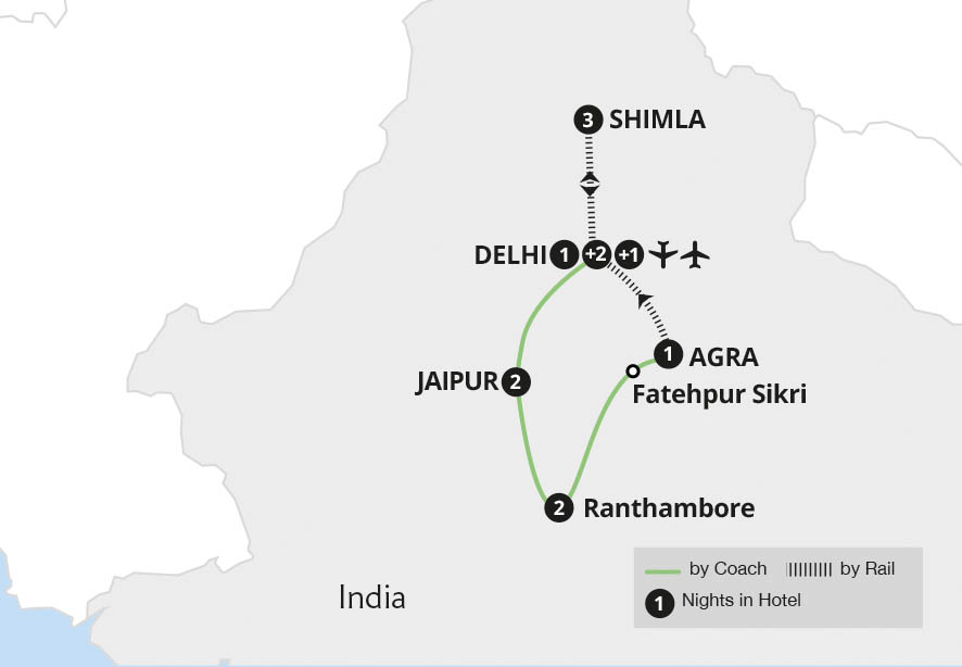 Your exploration of India's Golden Triangle and the Himalayan foothills begins at London Heathrow. Meeting the travelling group and Tour Manager, we board an evening flight to India. This captivating country dazzles and beguiles visitors with its heady mix of sights, scents and spiritual beliefs. During the flight, we can sit back and anticipate the fascinating experiences that await, from colonial history in Shimla and the energetic capital of Delhi to the iconic landmarks of Agra, Jaipur and stunning national parks.